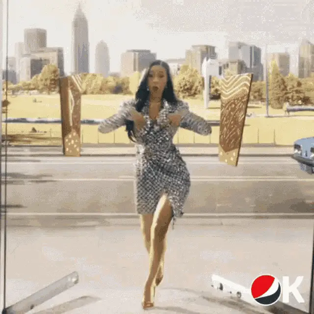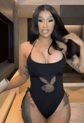 Cardi B poses confidently in a black Playboy bunny swimsuit, taking a drink from a bottle.