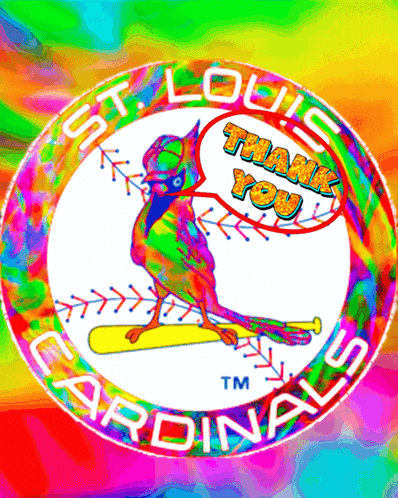 A vibrant, psychedelic St. Louis Cardinals logo with a bird on a bat, saying 'Thank You'.