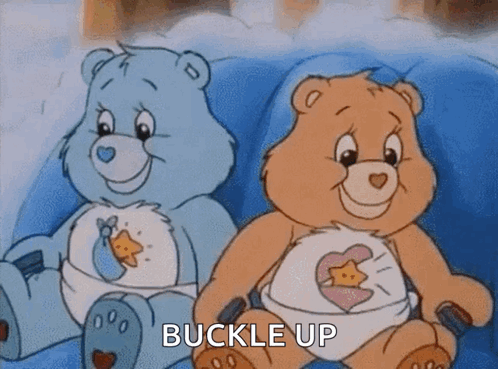 Two adorable Care Bears demonstrate the importance of safety by buckling up their seatbelts.