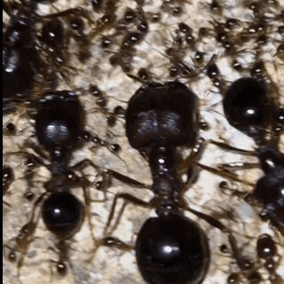 Close-up view of a Carebara Diversa ant colony, showcasing the large majors and smaller worker ants moving on a textured surface.