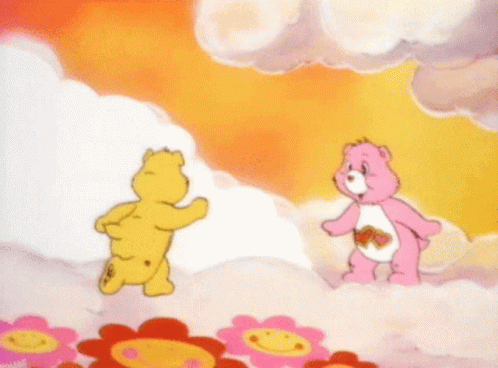 Love-a-Lot Bear and a yellow Care Bear greet a smiling sun in a cheerful, cloudy sky.