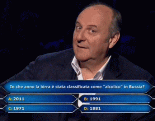 Man on quiz show reacts to a question about when beer was classified as alcoholic in Russia.