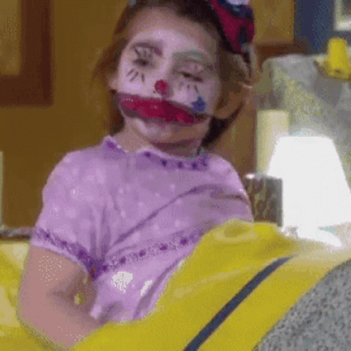 Lorena Queiroz as Dulce Maria Larios from Carinha De Anjo, with clown face paint and a bow.