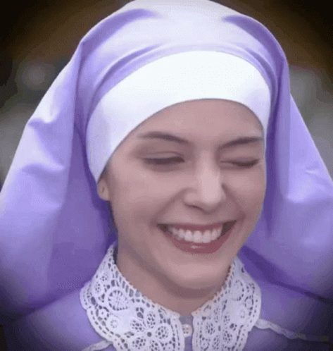 Bia Arantes as Irmã Cecília from Carinha de Anjo, smiling brightly and winking in her purple habit.