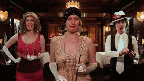 Carla Delaney and two women perform a lively Roaring 20s sketch comedy in vintage attire.