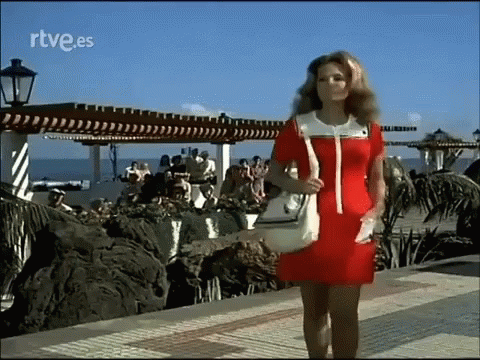 Carmen Sevilla playfully pulls a vintage phone receiver from her bag and pretends to make a call on a sunny promenade.