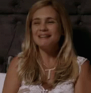 Carminha smiles and laughs, placing her hand on her chest while relaxing on a bed.