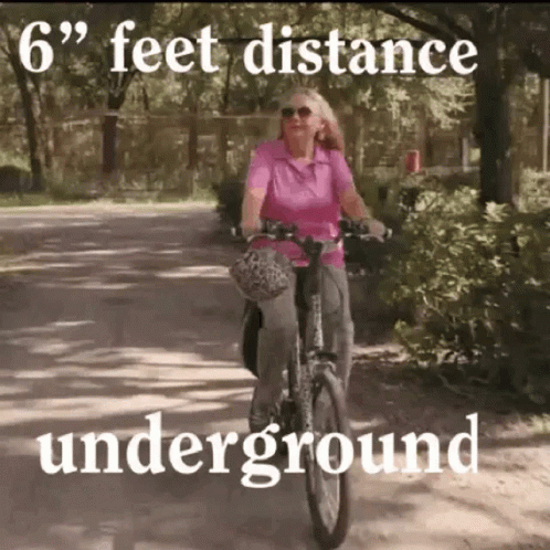 Carole Baskin from Tiger King rides a bicycle on a dirt path, with the meme text '6 feet distance underground' overlaid.