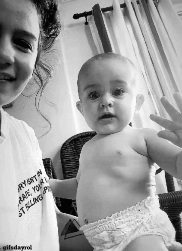 Carol Biazin smiles as baby Olivia Joy waves goodbye in this heartwarming black and white moment.