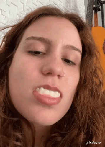 Carobiazin shows off her Fini vampire teeth toy in a close-up, with a guitar visible in the background.