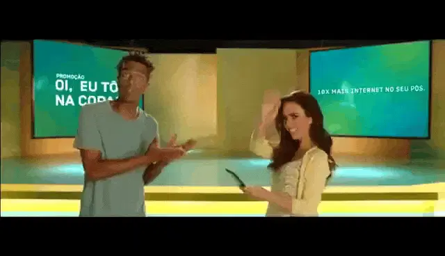 Carolbiazin says 'Oi, Bom Dia' with a funny face, showcasing her long curly hair.