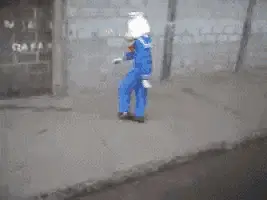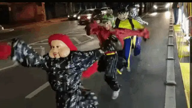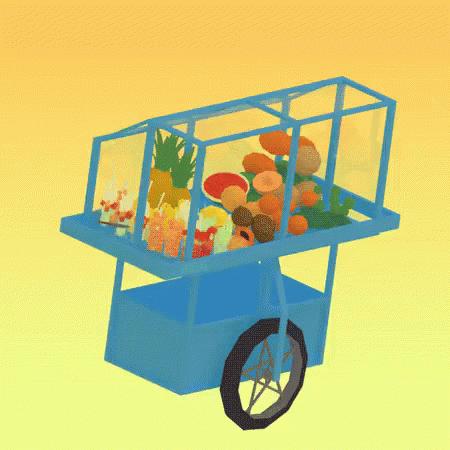 A vibrant blue fruit cart, or carreta de frutas, filled with fresh fruits and juices, set against a bright yellow background.