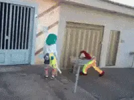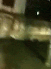 A blurry, low-quality video shows a Carreta Furacão character in a red and white costume running down a street at night.