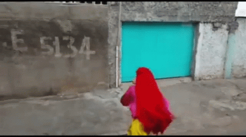 Person in a vibrant red and yellow costume with a red wig performs a mortal dance move in front of a building with 'SR. E 5134' graffiti.