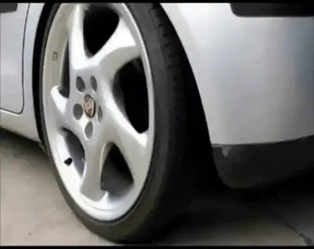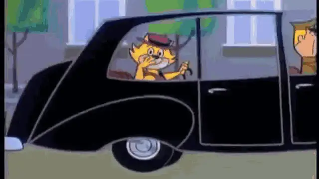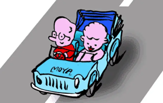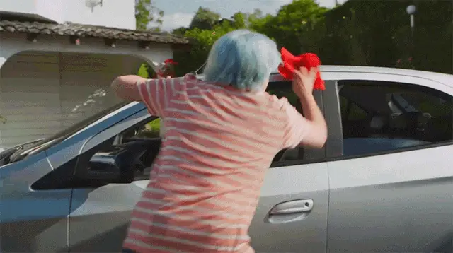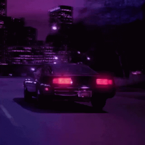 A car drives down a road at night with a purple sky and city lights in the background.
