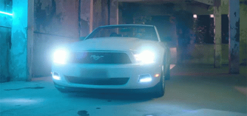 A white Ford Mustang with its headlights on, parked in a dimly lit structure, featuring the 'Wc No Beat' theme.