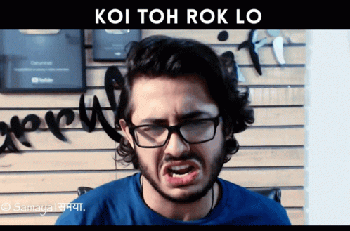 Carry Minati (Ajey Nagar) makes a funny face with the Hindi caption 'Koi Toh Rok Lo' (Someone Stop Me).