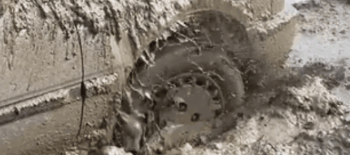 A car wheel spins helplessly, deeply embedded and covered in thick, brown mud.
