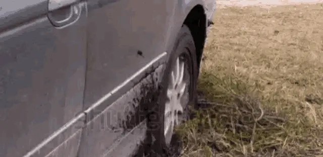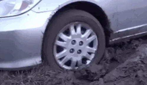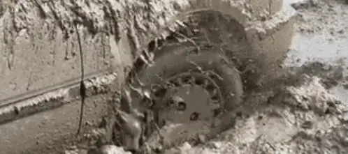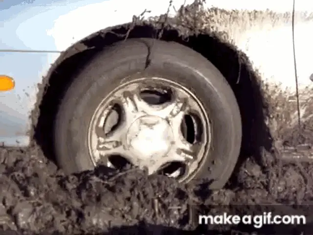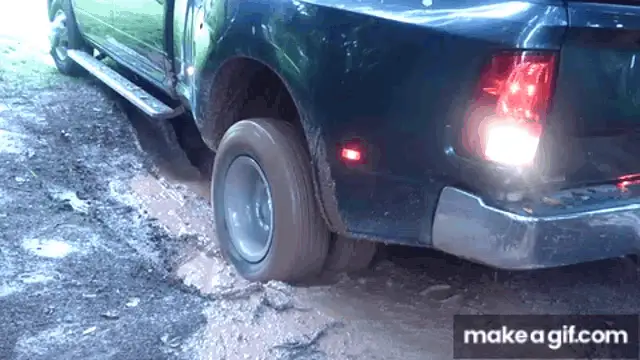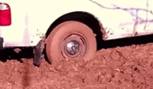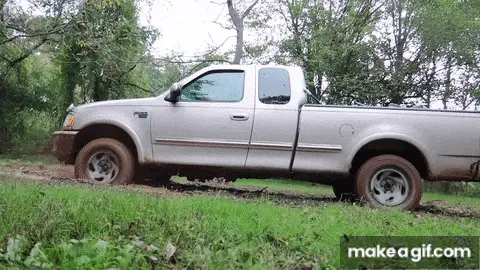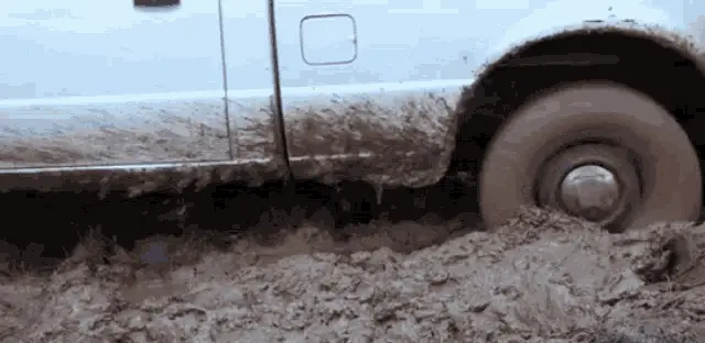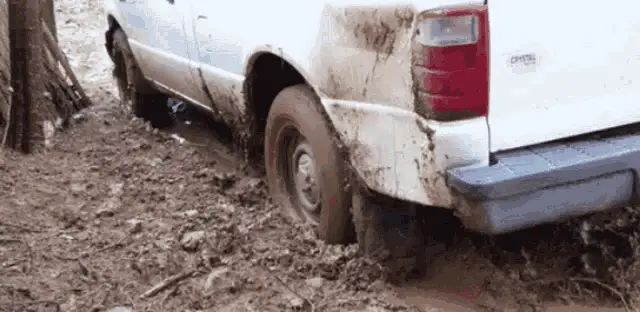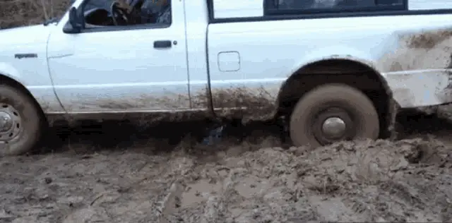 A white Ford pickup truck is completely stuck, submerged deep in a thick mud puddle.
