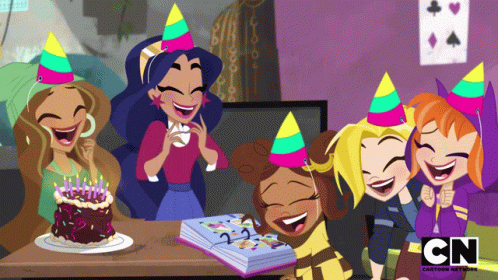 Kara Danvers, Diana Prince, Barbara Gordon, Jessica Cruz, and Karen Beecher laugh at a birthday party.
