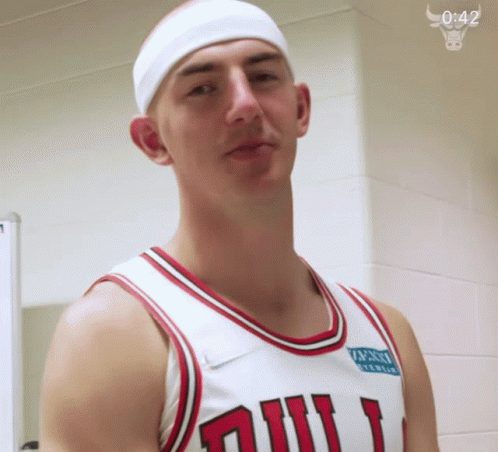 Alex Caruso shows off his Chicago Bulls jersey and headband.