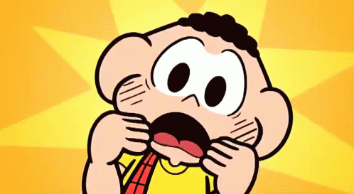 Cascão, the cartoon character, reacts with a distressed expression, biting his fingers.