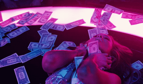 Jennifer Lopez as Ramona Vega, surrounded by falling dollar bills in a vibrant, neon-lit scene.