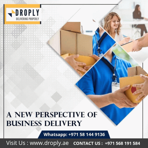 Droply delivery man with packages, offering fast cash on delivery services. Contact +971 58 144 9136.