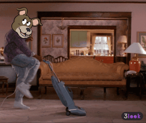 Cashew Cashew, a cartoon dog, vacuums a living room with an upright vacuum cleaner.