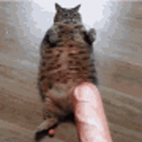 A fat tabby cat lies on its back, playfully hugging a large, pink baguette-shaped toy.