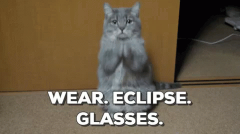 A cat sits up and 'begs' with a clear message to wear eclipse glasses for solar safety.