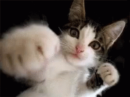 A playful cat with its paws outstretched, appearing to 'box' or swat at something.
