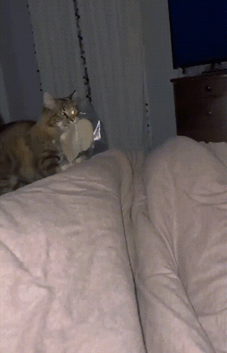 A mischievous cat carries a slice of bread across a bed, proudly displaying its culinary conquest.
