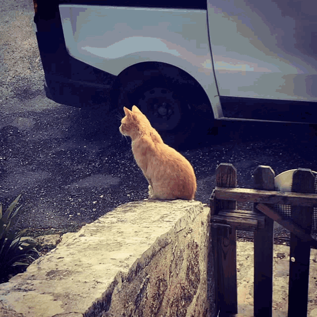 An orange cat sits on a stone wall, looking curiously at the camera before looking down.