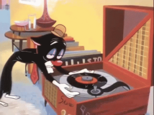 A black cartoon cat grooves to a vinyl record on a vintage player, then an orange cat reacts with a mischievous idea.