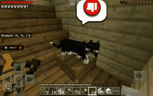 A black and white cat in Minecraft shows a dislike symbol above its head.
