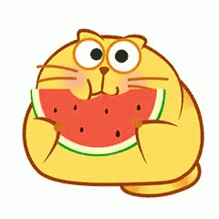 A happy kitty cat enjoying a slice of watermelon, making cute nom nom nom sounds.