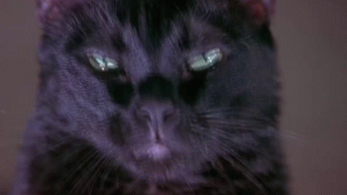 A black cat with wide, green eyes looks surprised, with text bubbles asking 'MEOW?' and 'WHAT?'.
