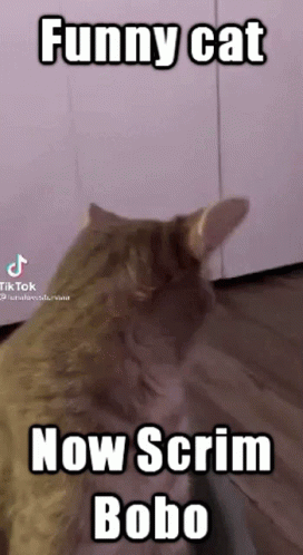 Funny cat Bobo reacts to 'Now Scrim' command with curious expressions, looking around and blinking.