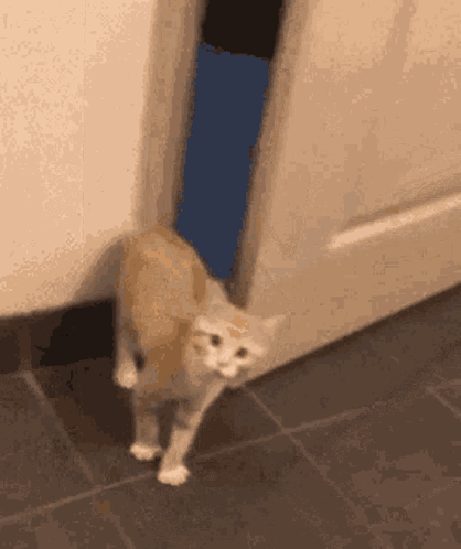 A scared cat peeks from behind a door, then quickly hides, with only its paw visible as it pulls the door shut.