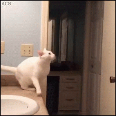A white cat attempts to jump from a bathroom counter to a door frame but misjudges and falls.