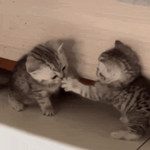 Two adorable tabby kittens engage in a cute interaction, appearing to shake hands with their tiny paws.