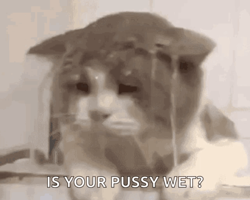 A cat getting wet with water dripping on its head, accompanied by the text 'IS YOUR PUSSY WET?'