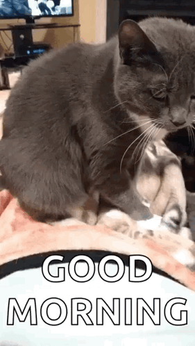 A gray cat kneads on a blanket with 'Good Morning' text, showing its morning routine.