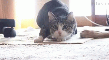 A cat wiggles its butt playfully, followed by a surprised reaction from Shaquille O'Neal.