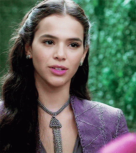 Bruna Marquezine as Catarina De Lurton, wearing a striking purple jacket and an intricate silver necklace.