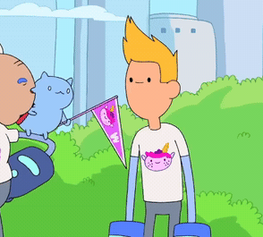 catbug is holding a little pink flag with wankershim's face on it and poking chris like an annoying but cute little child
