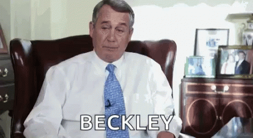 A man in a white shirt and blue tie makes a 'ready to go' gesture, combining a cross sign with a thumbs up, with 'BECKLEY' text.