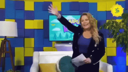 Cathy Barriga waves and smiles in a studio, standing in front of a screen displaying 'MaipĂș Kids'.
