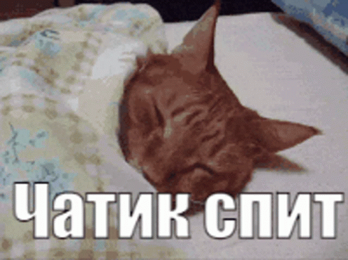 A cute ginger cat is sound asleep under a blanket, with the Russian text 'ЧАТИК СПИТ' (The chat is sleeping) overlaid.